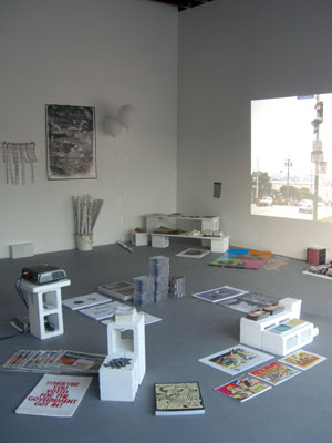 Sunday October 26: Exchange Rate: 2008 presents performances in the gallery space. Exchange Rate: 2008 is an international performance exchange organized by artist Elana Mann in response to the US presidential elections and includes artists from Brazil, Denmark, Israel, Mexico, South Korea, Ukraine, and the US among others. 6-8pm Saturday Nov. 1: Evil Dead 8: the end is near, a Day of the Dead inspired memorial for the final days of the Bush administration. Celebrating the end of one evil while not knowing what is lurking ahead, Evil Dead 8 includes skill sharing, music, dancing, a bookmobile project created by Irina Contreras and Kelly Besser called The Miracle, and guerilla interventions by AK-Ami and her mother Maleeka Kobrah. 8pm Tuesday November 4: Election returns will be projected in the gallery with several of the participating artists present and Lee Azzarello and Sarah Kanouse "Voices of America" internet radio project will be broadcast. 5pm on Saturday November 8: FOCUS